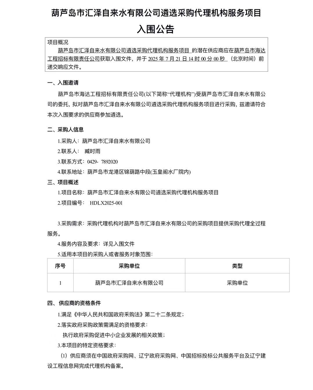 葫蘆島市匯澤自來水有限公司遴選采購代理機構(gòu)服務(wù)項目 入圍公告
