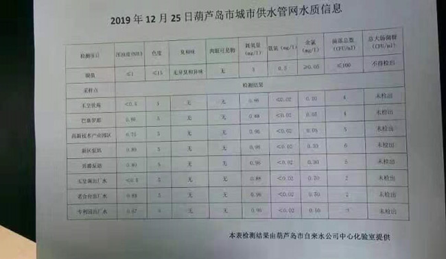 2019年12月25日葫蘆島市城市供水管網(wǎng)水質(zhì)信息