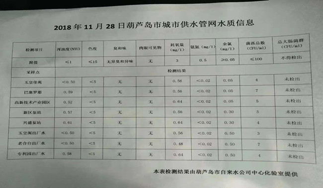 2018年11月28日葫蘆島市城市供水管網(wǎng)水質(zhì)信息