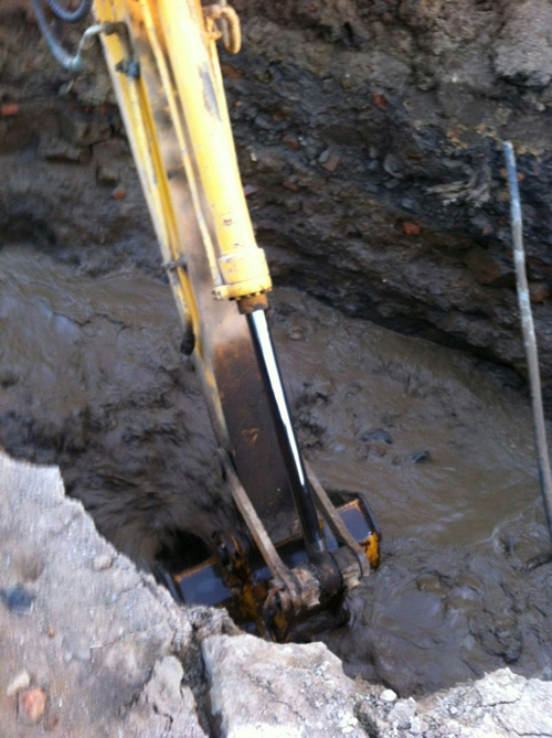 2015年4月16日下午4:30分,二分公司供水維修隊(duì)接到報(bào)修電話,岔溝施工隊(duì)負(fù)責(zé)人稱他們在建設(shè)位于市政府后身的岔溝回遷樓過程中,因鉤機(jī)作業(yè)時(shí)挖壞了供水主管道,造成大量自來水外流。現(xiàn)場破壞面積過大,已造成周邊水流大量淤積。接到電話后,公司分管營業(yè)的副經(jīng)理馬旭和營業(yè)二分公司經(jīng)理張志明立即帶領(lǐng)維修隊(duì)人員在20分鐘內(nèi)趕到現(xiàn)場,在進(jìn)行勘察的同時(shí),搶修物質(zhì)運(yùn)達(dá)維修現(xiàn)場,一場供水管線搶修工作緊張而有序地展開。