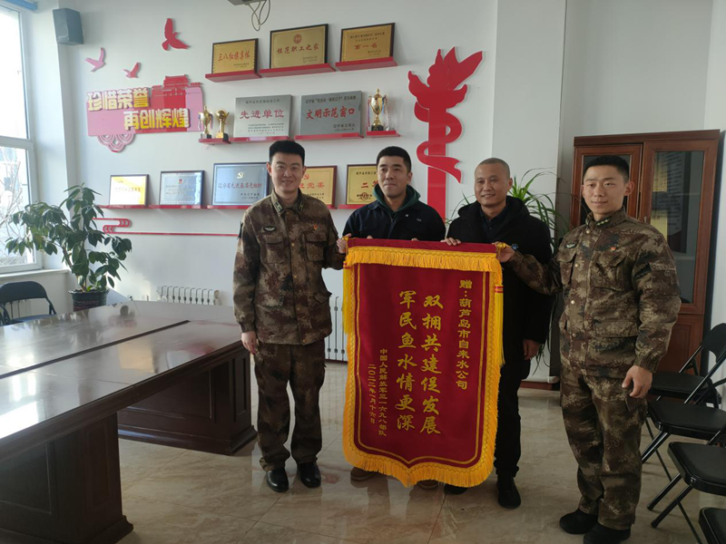 1月28日下午,駐葫某部領(lǐng)導(dǎo)專程來到自來水公司,對(duì)自來水公司在保障供水過程中提供的支持和幫助表示感謝,并送來錦旗。