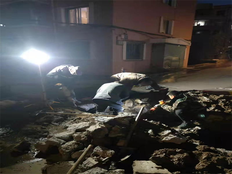11月17日,宏業(yè)小街區(qū)域出現(xiàn)漏點。營業(yè)三分公司維修人員趕到現(xiàn)場后發(fā)現(xiàn),該區(qū)域地處坡路,屬于商混路面,地面厚,而且還在供暖管下方,測漏人員很難定準(zhǔn)漏點,要把整個路面破開才能找到漏點。由于開裂處地理位置特殊,打電鎬難度大,給施工造成困難。搶修人員相互配合,輪換跳入滿是積水的泥坑進行搶修作業(yè)。刺骨的冰水浸透了衣服,泥水沒過膝蓋,他們顧不上嚴(yán)寒的侵襲,一刻也不放松搶修的進度。大家堅守在搶修第一線。餓了,啃幾口干糧;困了,就輪流打個盹,爬起來繼續(xù)干。靠著這種工作態(tài)度,大家從下午3點開始,經(jīng)過9個多小時持續(xù)不間斷奮戰(zhàn),漏點修復(fù),到晚上近11點才維修完畢,恢復(fù)供水!
