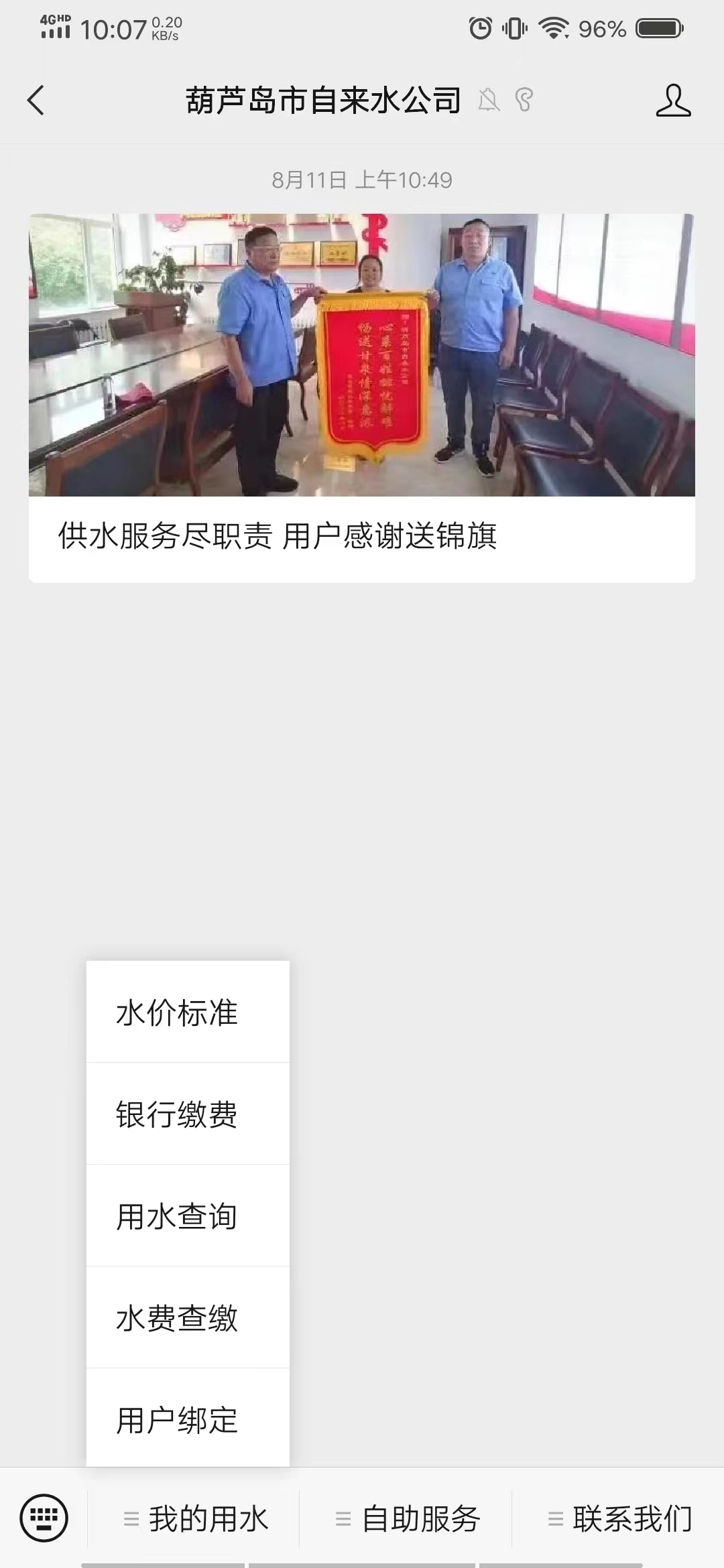 進(jìn)入葫蘆島市自來水公司公眾號(hào)—點(diǎn)擊我的用水—點(diǎn)擊水費(fèi)查繳