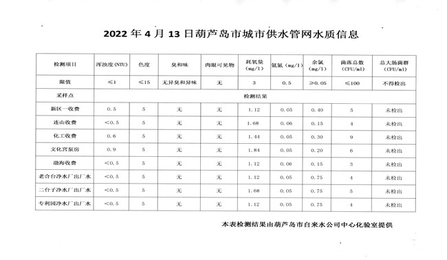 2022年4月13日葫蘆島市城市供水管網(wǎng)水質(zhì)信息
