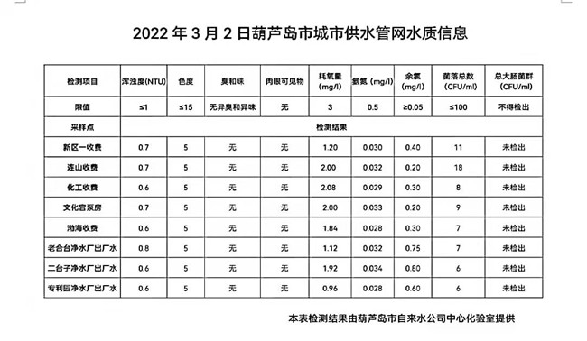 2022年3月2日葫蘆島市城市供水管網(wǎng)水質(zhì)信息