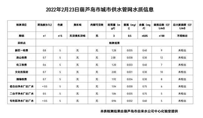 2022年2月23日葫蘆島市城市供水管網(wǎng)水質(zhì)信息