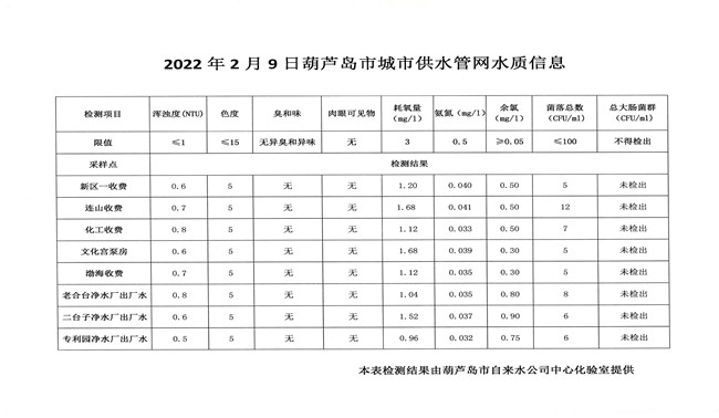 2022年2月9日葫蘆島市城市供水管網(wǎng)水質(zhì)信息