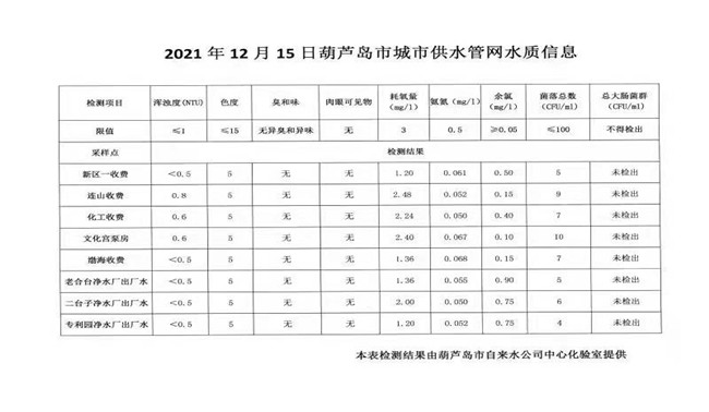 2021年12月15日葫蘆島市城市供水管網(wǎng)水質(zhì)信息