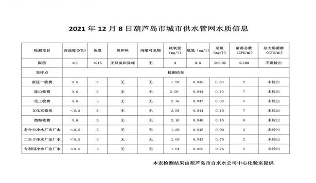 2021年12月8日葫蘆島市城市供水管網(wǎng)水質(zhì)信息