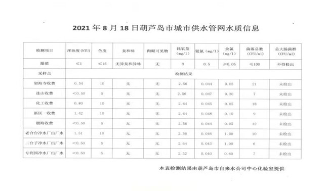 2021年8月18日葫蘆島市城市供水管網(wǎng)水質(zhì)信息