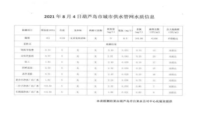 2021年8月4日葫蘆島市城市供水管網(wǎng)水質(zhì)信息