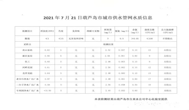 2021年7月21日葫蘆島市城市供水管網(wǎng)水質(zhì)信息