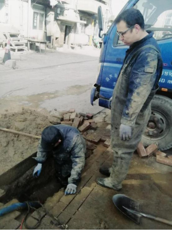 正月初二9:30,營業(yè)第二分公司接到用戶報(bào)修電話,反映教育園區(qū)B區(qū)73號樓前供水管線漏水。值班維修人員高峰、張良、張少輝第一時(shí)間趕赴現(xiàn)場,當(dāng)即投入到緊張的搶修當(dāng)中。尋找漏點(diǎn)需要破除冰層、挖掘凍土。為了搶時(shí)間,他們用鐵鎬、鐵鍬手工輔助除冰、破土。在室外溫度-15℃的工作環(huán)境下,經(jīng)過兩個(gè)小時(shí)的挖掘,終于找到漏點(diǎn),順利完成維修。