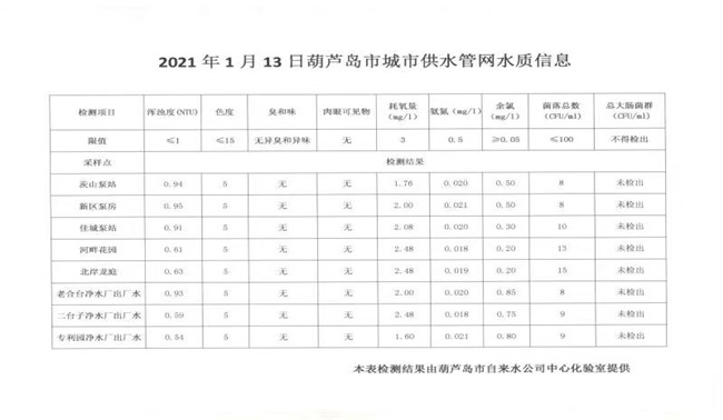 2021年1月13日葫蘆島市城市供水管網(wǎng)水質(zhì)信息