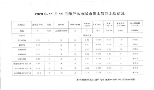 2020年11月11日葫蘆島市城市供水管網(wǎng)水質(zhì)信息