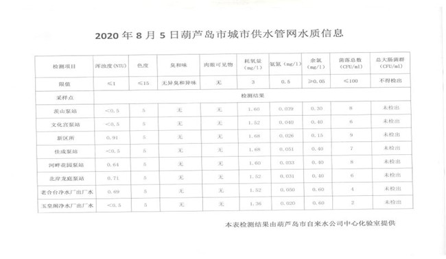 2020年8月5日葫蘆島市城市供水管網(wǎng)水質(zhì)信息