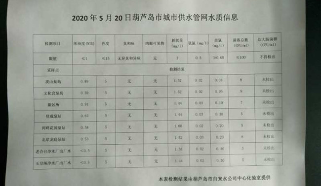 2020年5月20日葫蘆島市城市供水管網(wǎng)水質(zhì)信息