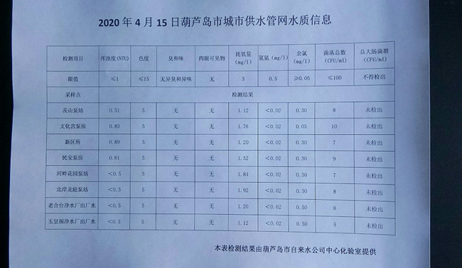 2020年4月15日葫蘆島市城市供水管網(wǎng)水質(zhì)信息