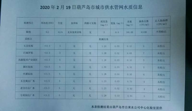2020年2月19日葫蘆島市城市供水管網(wǎng)水質(zhì)信息