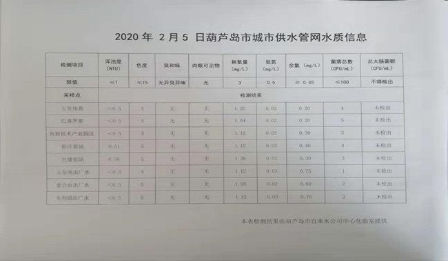 2020年2月5日葫蘆島市城市供水管網(wǎng)水質(zhì)信息
