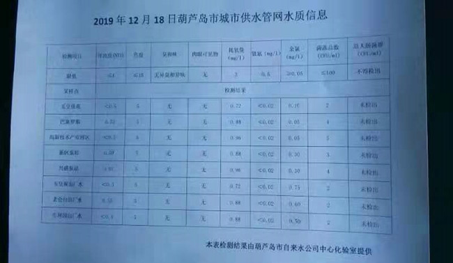 2019年12月18日葫蘆島市城市供水管網(wǎng)水質(zhì)信息
