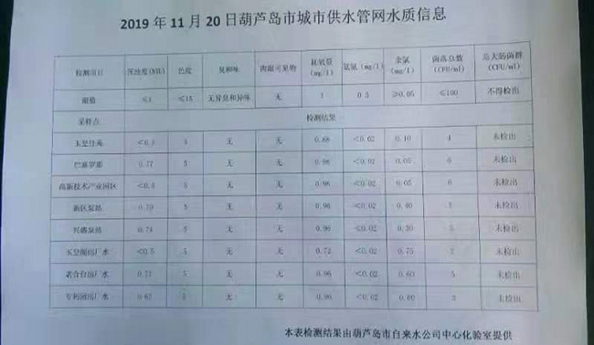 2019年11月20日葫蘆島市城市供水管網(wǎng)水質(zhì)信息