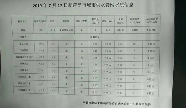 2019年7月17日葫蘆島市城市供水管網(wǎng)水質信息