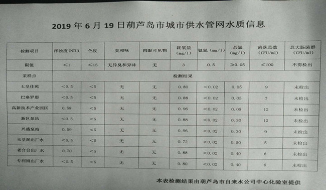 2019年6月19日葫蘆島市城市供水管網水質信息
