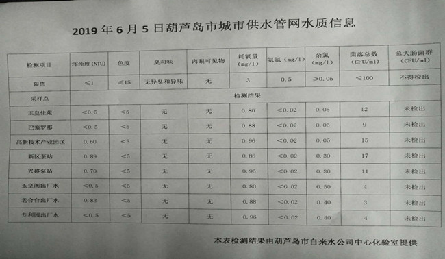 2019年6月5日葫蘆島市城市供水管網(wǎng)水質(zhì)信息