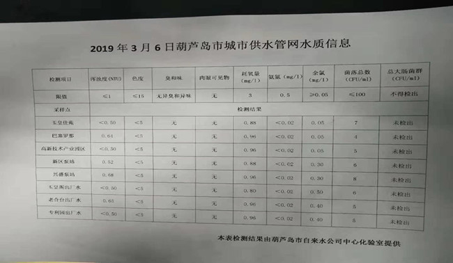 2019年3月06日葫蘆島市城市供水管網(wǎng)水質(zhì)信息