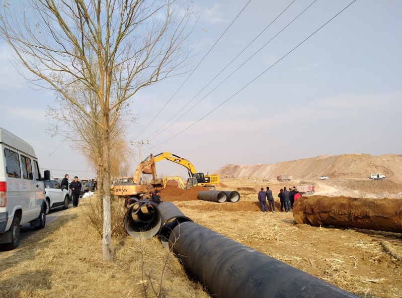 當(dāng)天下午4時(shí),市自來(lái)水工程總公司抽調(diào)的35名搶修精干力量投入搶修作業(yè),同時(shí)出動(dòng)大型挖掘機(jī)3臺(tái),搶修設(shè)備包括大小發(fā)電機(jī)組7臺(tái),水泵3臺(tái),電焊機(jī)6臺(tái)。搶修難度遠(yuǎn)比預(yù)想的要困難得多。地下管線十分復(fù)雜,破損點(diǎn)位排查困難,實(shí)施停水作業(yè)后,最終確定破損位置,因次生土壤塌方將200余延長(zhǎng)米管線壓斷,并且破口較大,經(jīng)現(xiàn)場(chǎng)有關(guān)技術(shù)人員一致研究決定采取徹底換管的方案。由于受損管線長(zhǎng)達(dá)200余米,并且管徑大,原材料庫(kù)存少,公司材料處當(dāng)場(chǎng)聯(lián)系,緊急調(diào)動(dòng)新管線。搶修過(guò)程中,需要穿越鋅廠位于地下2.2米深的DN800供水管線,使新的輸水管線需要深挖至6米深的地下實(shí)施安裝。并且安裝的管邊離1萬(wàn)伏的電纜不到1米遠(yuǎn),十分危險(xiǎn),為保障安全,施工中先用吊車(chē)、挖掘機(jī)扶住電線桿子后再作業(yè)。初冬的11月份,深夜氣溫驟降。搶修人員冒著零下十幾度的嚴(yán)寒,輪流吃飯,舍不得片刻休息,搶時(shí)間、爭(zhēng)速度。