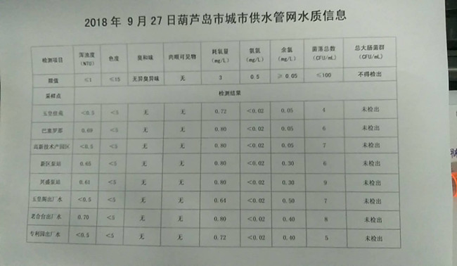 2018年9月27日葫蘆島市城市供水管網(wǎng)水質(zhì)信息