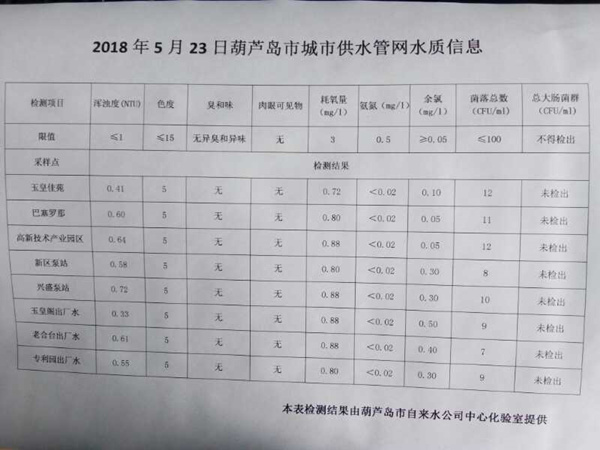 2018年5月23日葫蘆島市城市供水管網(wǎng)水質(zhì)信息