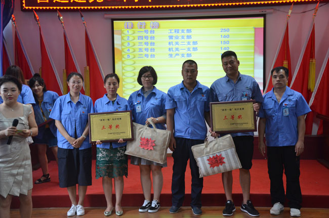 此次競(jìng)賽內(nèi)容包括《黨章》、《廉政準(zhǔn)則》、《習(xí)近平系列重要講話》等知識(shí),公司5個(gè)黨支部集體參加比賽,經(jīng)過緊張激烈而精彩的角逐,工程公司支部獲得一等獎(jiǎng),機(jī)關(guān)二支部、營(yíng)業(yè)支部獲得二等獎(jiǎng),機(jī)關(guān)一支部、生產(chǎn)支部獲得三等獎(jiǎng)。