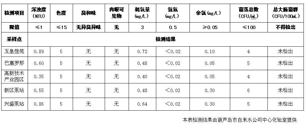 2017年1月4日葫蘆島市城市供水管網(wǎng)水質(zhì)信息