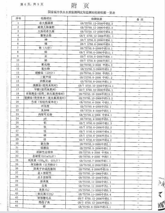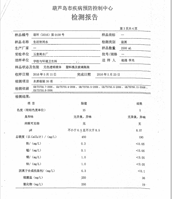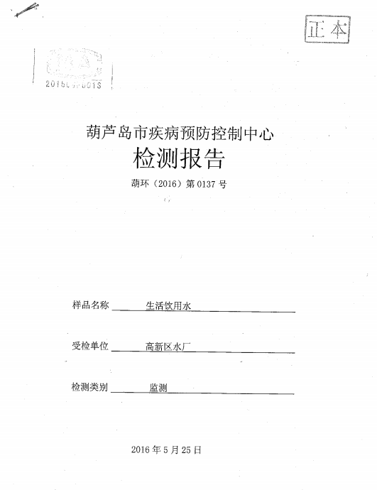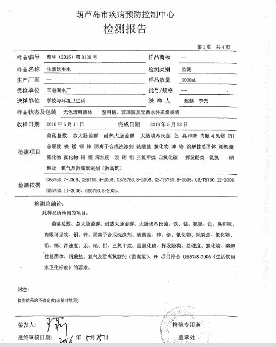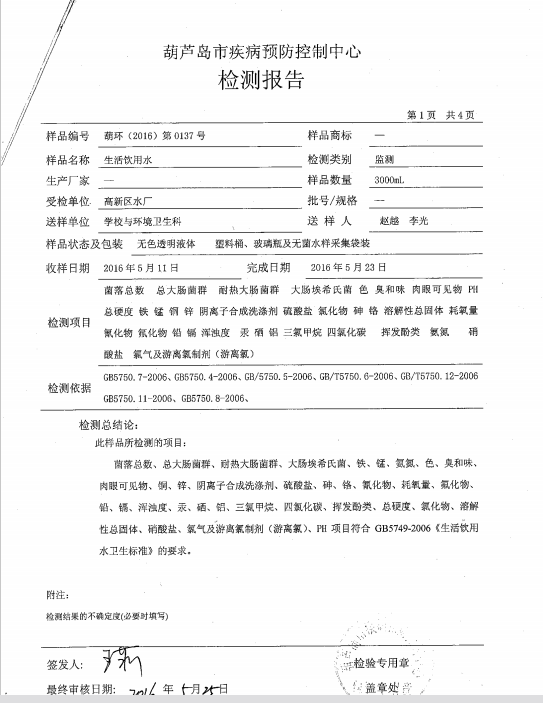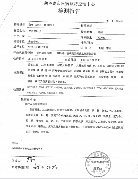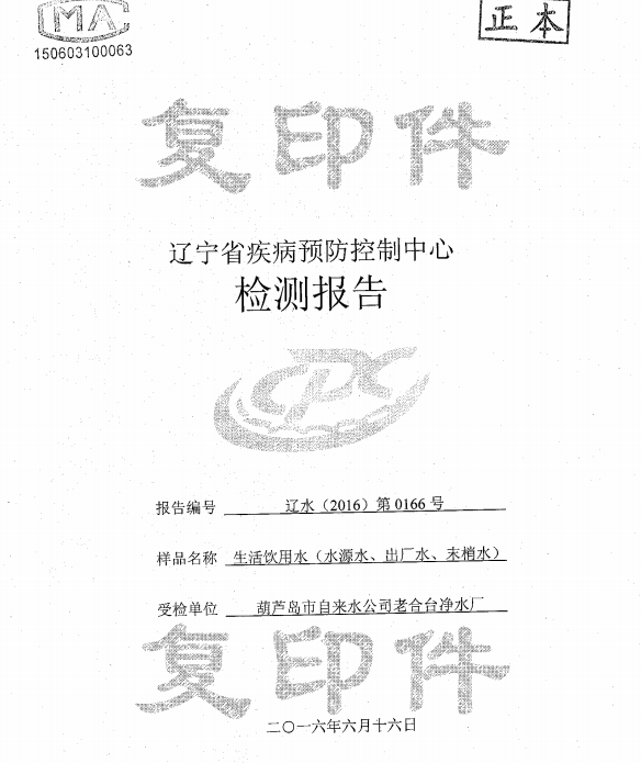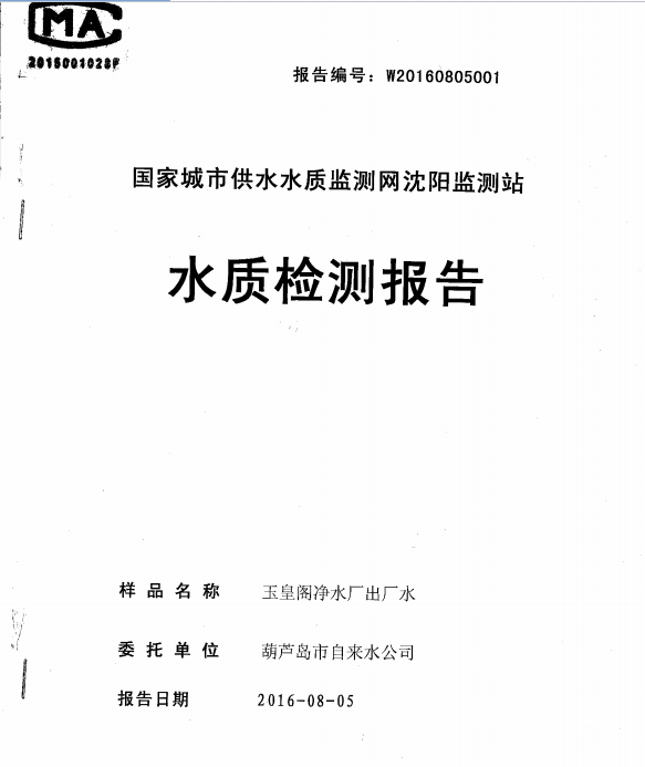 葫蘆島市自來水公司2016年水質檢測報告公示