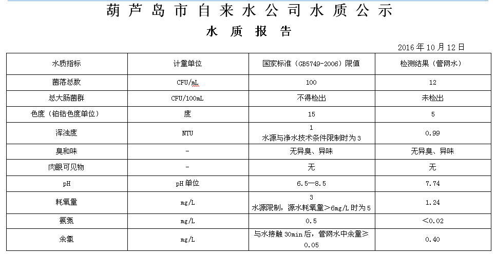 2016年10月第二周 水質(zhì)報(bào)告